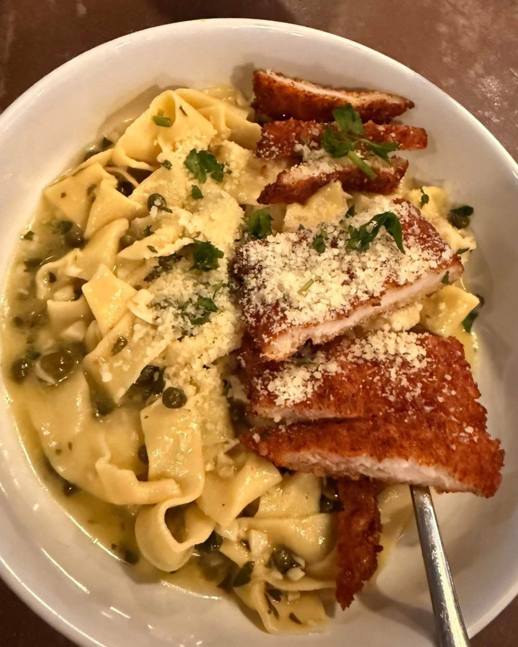 My wife’s entrée was another story. The ingredients were old friends. They had obviously been hanging out and enjoyed one another’s company. The crispy chicken was thin, flavorful, and pan-fried wonderfully. The piccata sauce with capers soaked into the chicken and tagliatelle, with a beautiful lemon freshness dancing around shouting “Look at me!” It had that mangiami (eat me) attitude. I ended up taking parts of her dish and incorporating them into mine to bring out some flavor, and it worked nicely.
