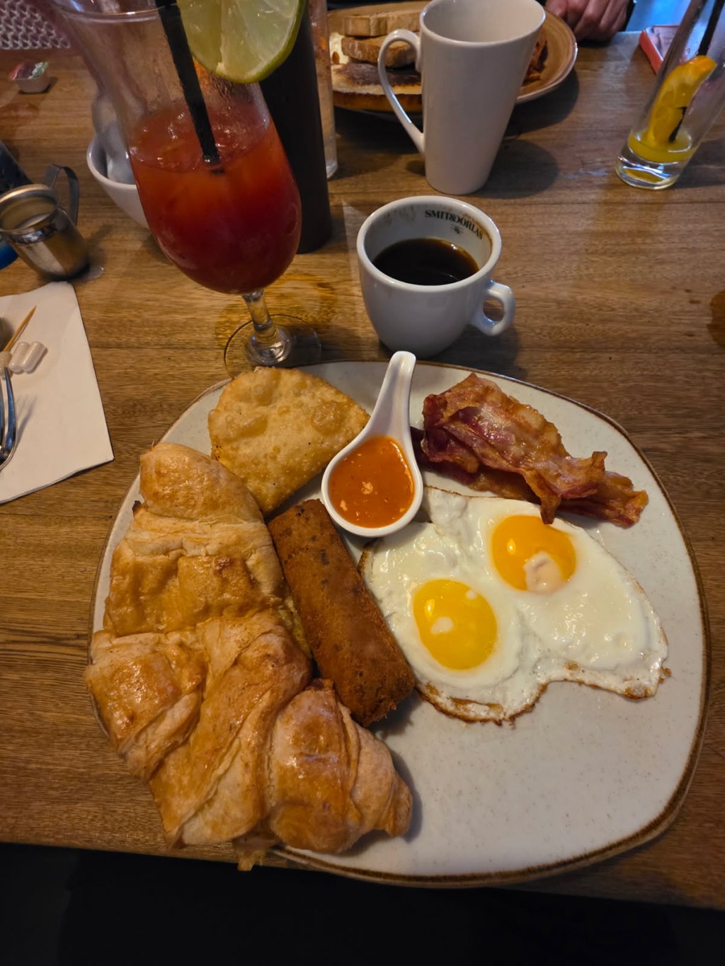 I always order the Aruban Breakfast. For me, there is no other choice. It comes with two sunny side up eggs, a freshly baked warm croissant, crispy bacon, and two island staples, a croquette and a cheese pastechi.